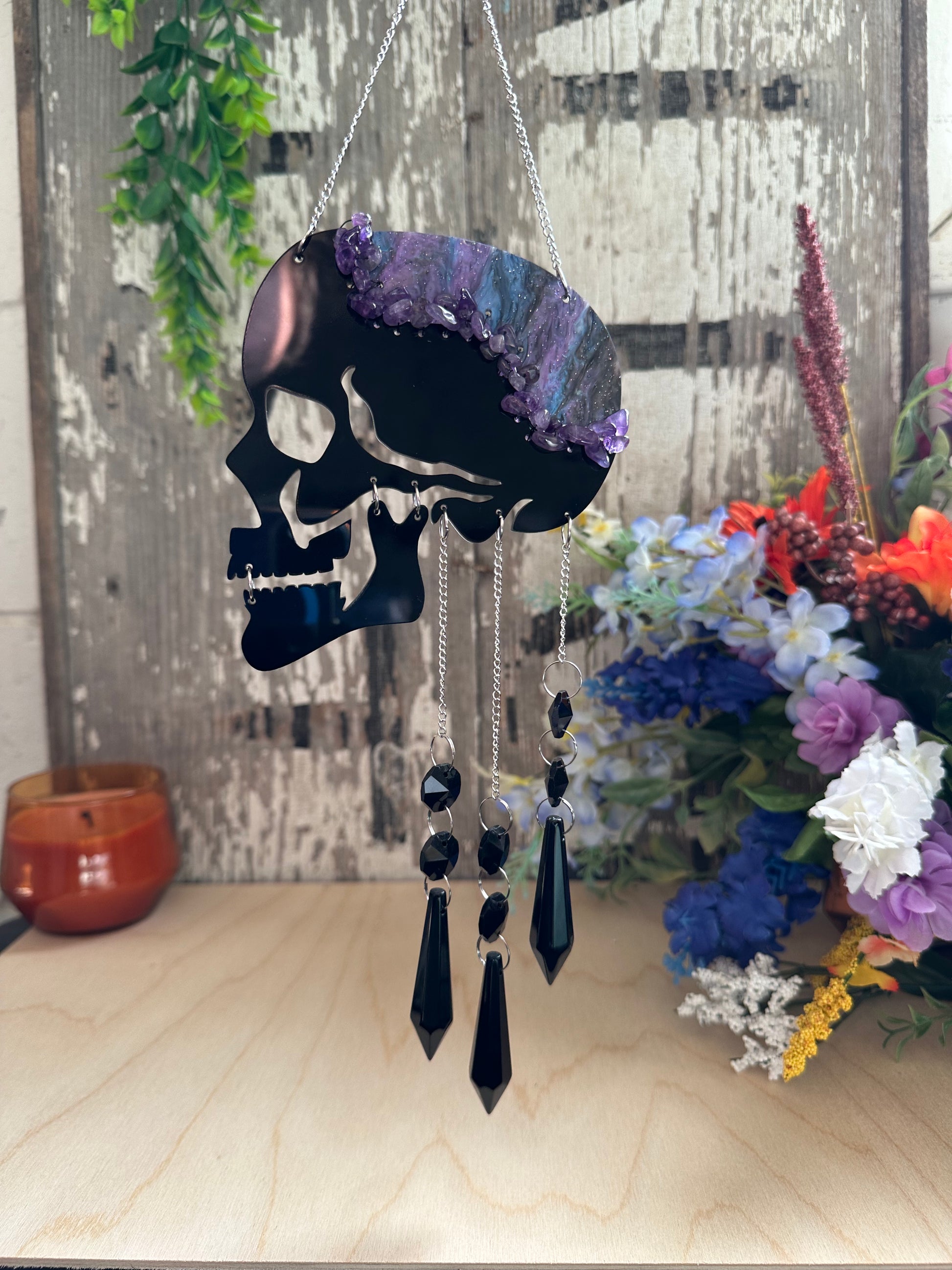 -These are hand made using laser cut acrylic, Amethyst crystal chips, glass icicle prisms, and metal chain.